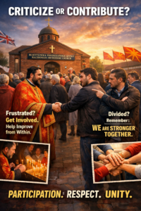 As someone who has been involved in founding few Macedonian organisations in the UK as well as serving on a church committee, I know first-hand how much unpaid work, responsibility, and personal sacrifice goes into keeping these organisations alive. It is not easy work, it depends entirely on volunteers who give their time and energy for the benefit of everyone. In recent times, I have heard a lot of criticism directed at the priest and church communities in general. My response is simple: get involved. If something can be improved, let’s do it together, constructively, from within.